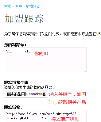 2.你会得到一个ID,你可以在 首页 » 账户 » 加盟跟踪 查看到,然后可以在跟踪链接生成处输入产品关键字,比如“闪迪”获取相关产品列表,选中要推广的产品,生成URL!